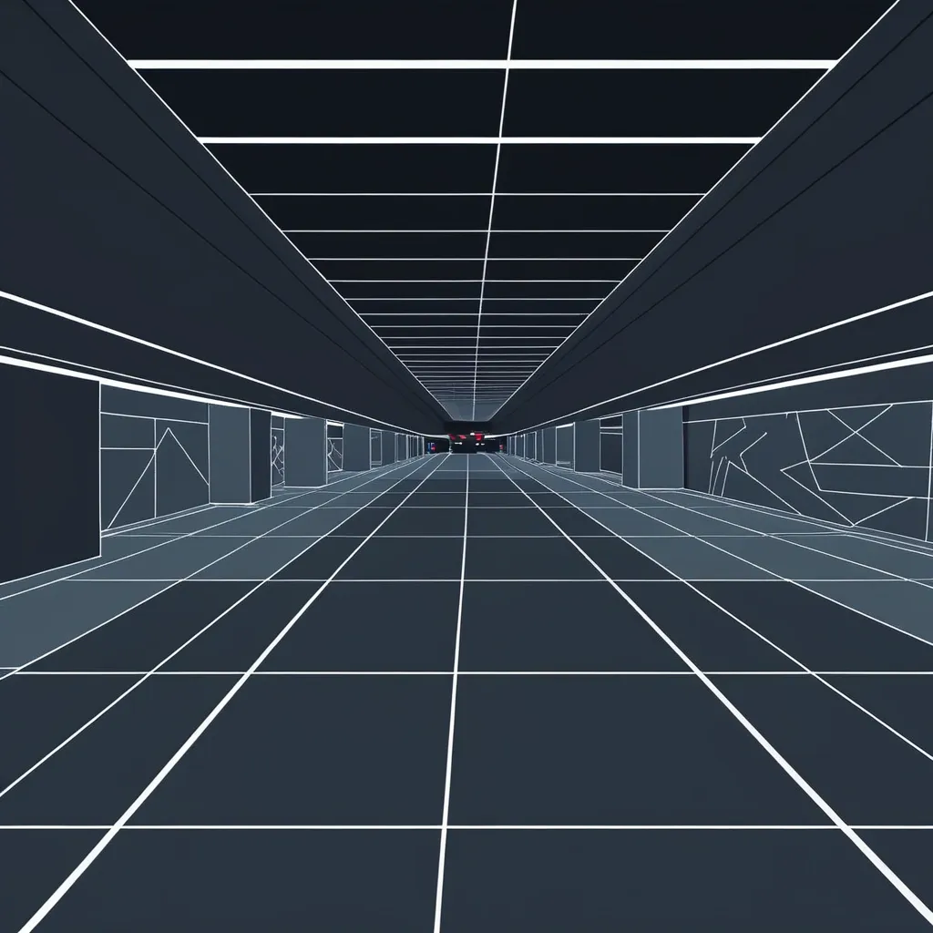 animation storyboard frame , rough sketch animatic style , simple cartoon characters made of geometric body shapes , clean line art , minimal shading , entrance of an underground parking garage at night , minimal line city environment , cinematic angle ,