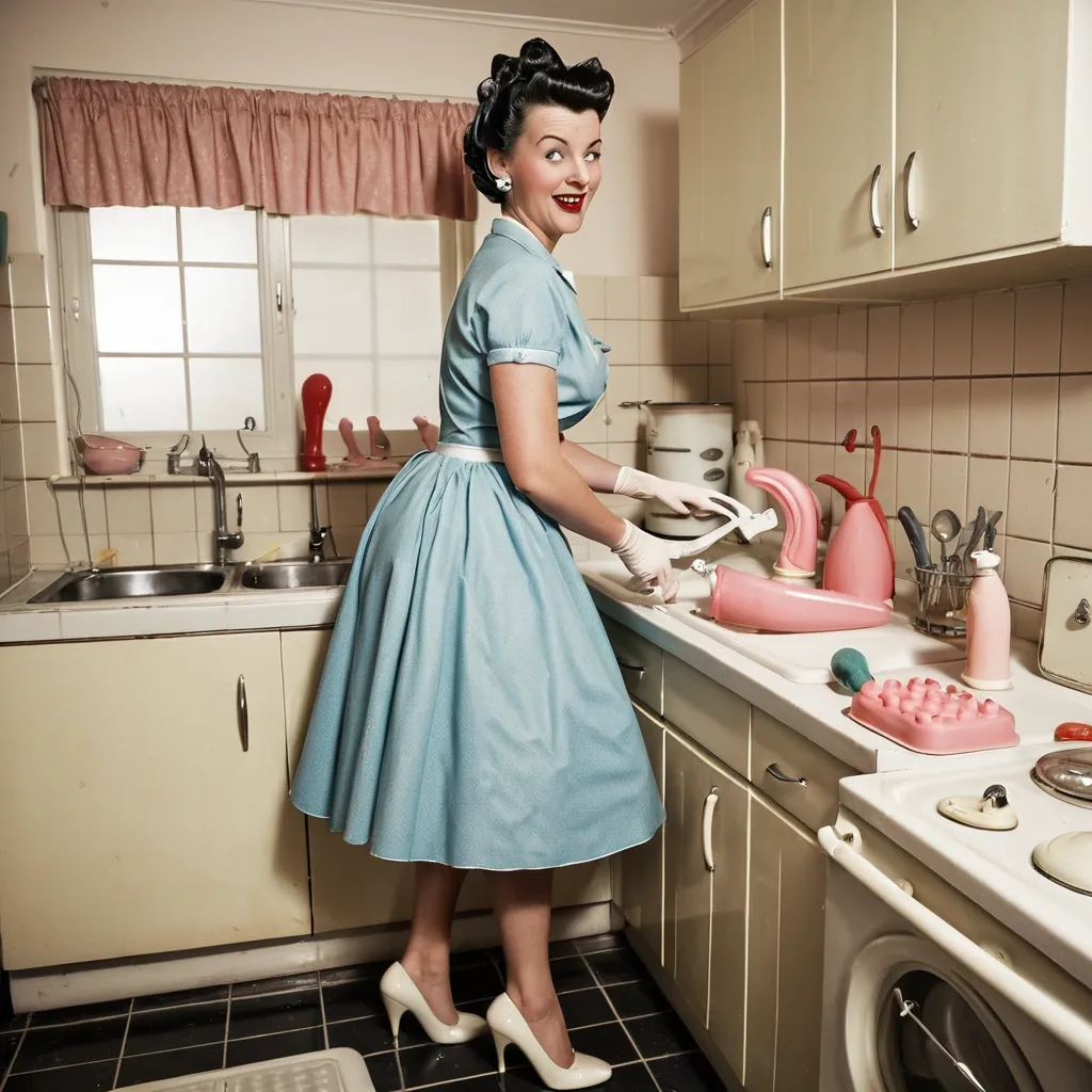 A funny 1950s style image of a wog mum in her kitchen , standing at the kitchen sink. She is washing her dildos , and drying them in the dish rack. She is wearing 1950s style dress and high heels , rubber cleaning gloves up to her elbows and has a curled up-do hairstyle. On the dish rack there are a range of different shaped and length dildos (sex toys) drying after being washed.Retro , 1950s , pin up ,
