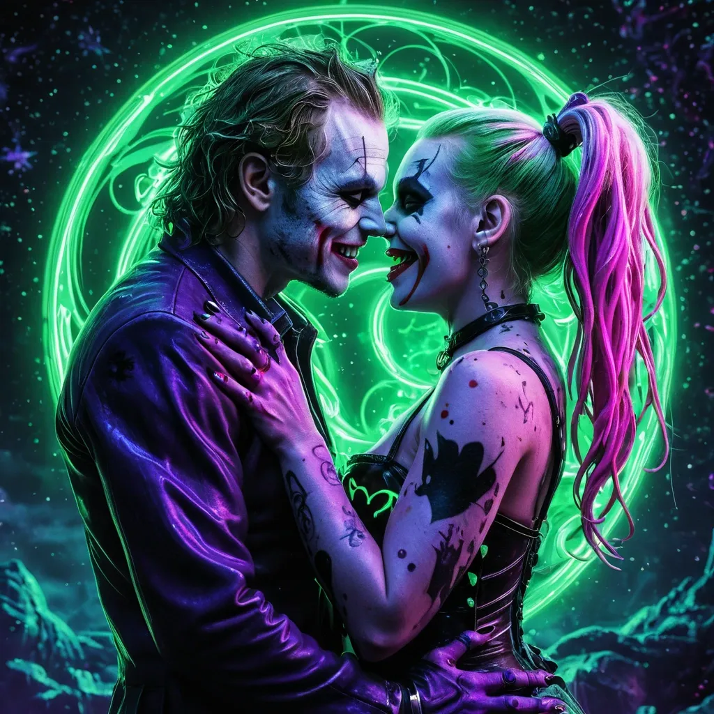 A highly-realistic , detailed , 4K photorealistic image of Heath Ledger and Margot Robbie’s interpretation of The Joker and Harley Quinn. An intensely passionate scene of the two locked in a chaotic loving embrace in a cosmic galaxy. They’re surrounded by swirling neon-green bioluminescent stars and ashimmering night sky galaxy , under an iridescent glowing moon , casting an ethereal light upon the couple. The image is full of raw passion. Neon , UV blacklight colors—electric pink , venomous green , and pulsating purple—light up their forms , with Joker’s scarred grin glowing , and Harley’s neon-sparkled pigtails shining. Magical fantasy style image with a psychedelic edge , blending fantasy and madness in a vibrant , high-contrast scene. ,