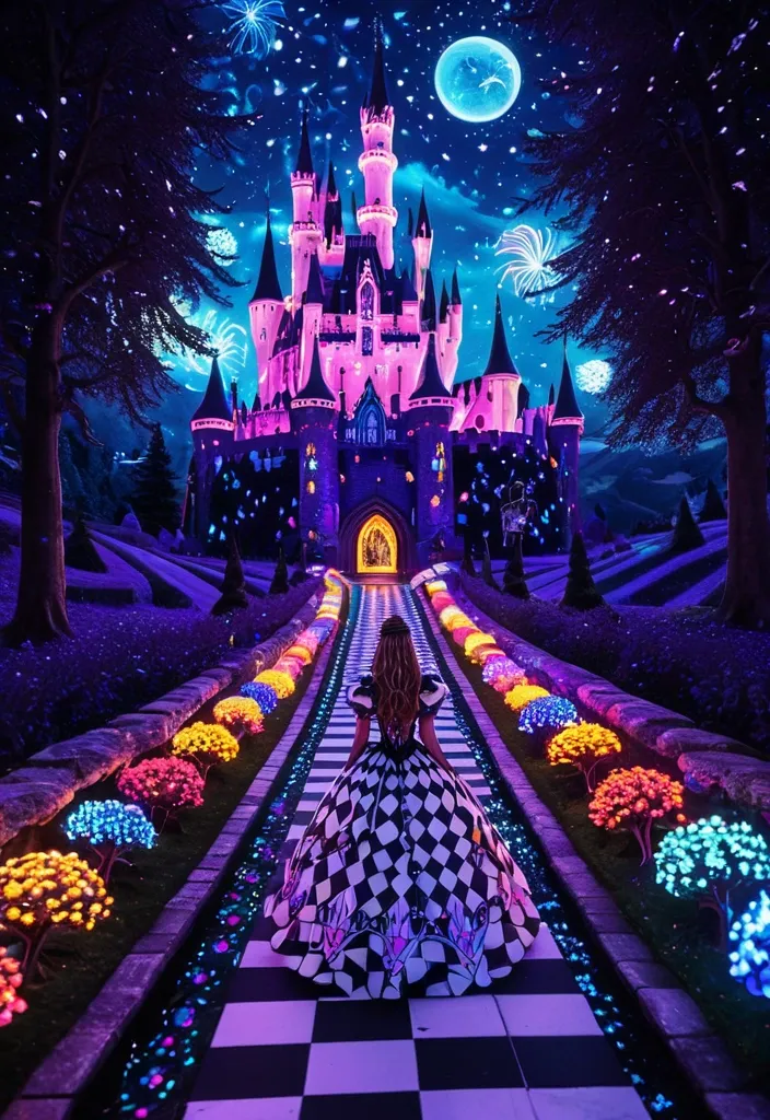 A magical fairytale style image of Alice , walking down a black and white harlequin checkered pathway in a magical neon Wonderland. Different types of flowers glow vibrantly in all colours of the rainbow along the path that leads to a magical Disney style castle in the distance. Coloured fairy lights hang from the trees , and the castle glows a brilliant shade of purple and blue. Fireworks fill the night sky , shimmering down on the castle below. highly-detailed , fantasy , whimsical , vivid colours , glowing , neon ,