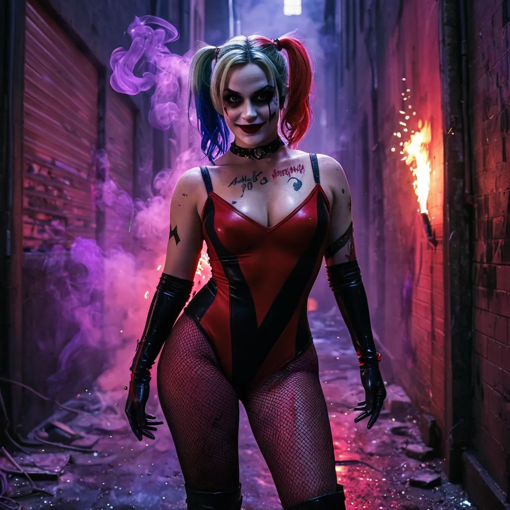 A realistic portrait of Harley Quinn in a dark , alleyway. She wears her red and black bodysuit , with fishnet stockings and high boots. She has dark bold makeup , with bright pink and blue in the tops of her blinds hair. The alleyway is filled with purple and green swirls of smoke , and sparks of fire flickering around her. Dark destroyed buildings in the background. ,