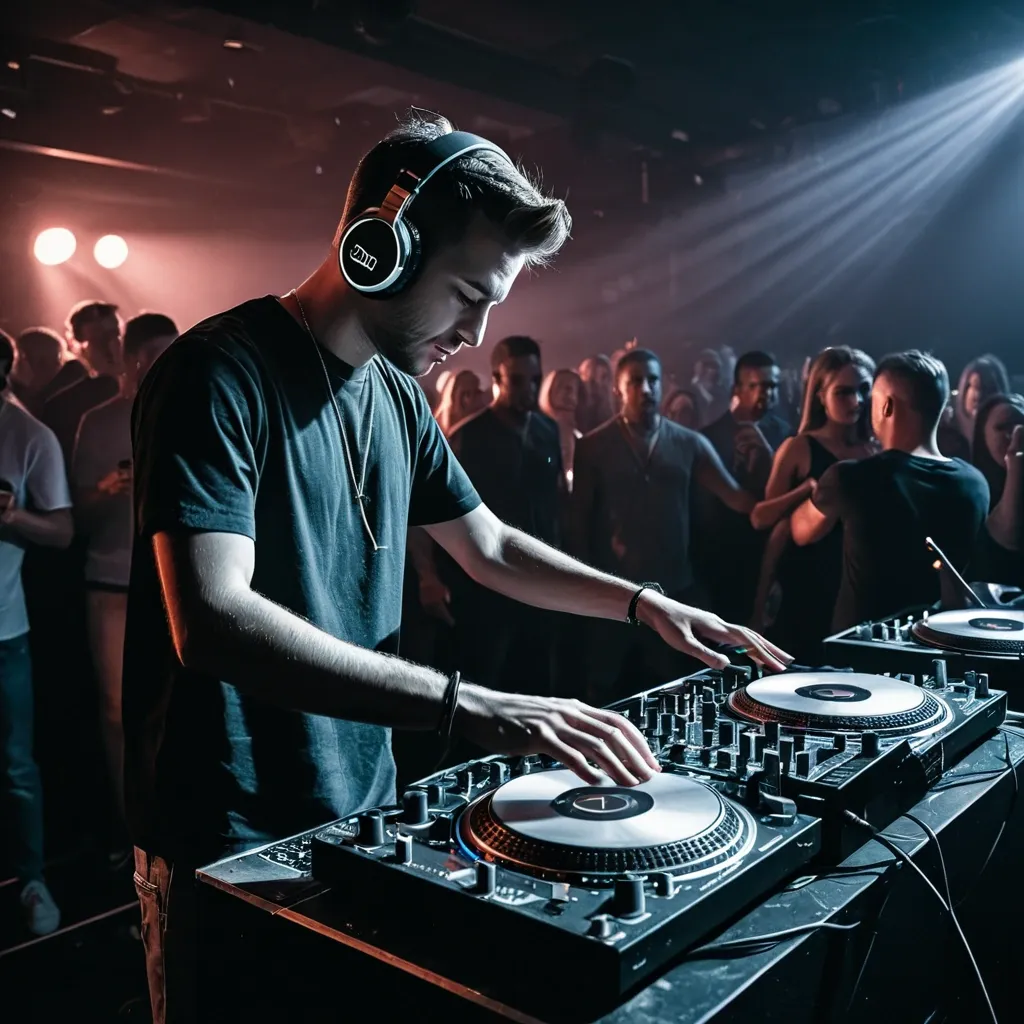 DJ walking out of a nightclub with the neon lights cut off and a touch of a sun coming up. Have him on suit pants and a t shirt with a mixing console underneath one arm ,