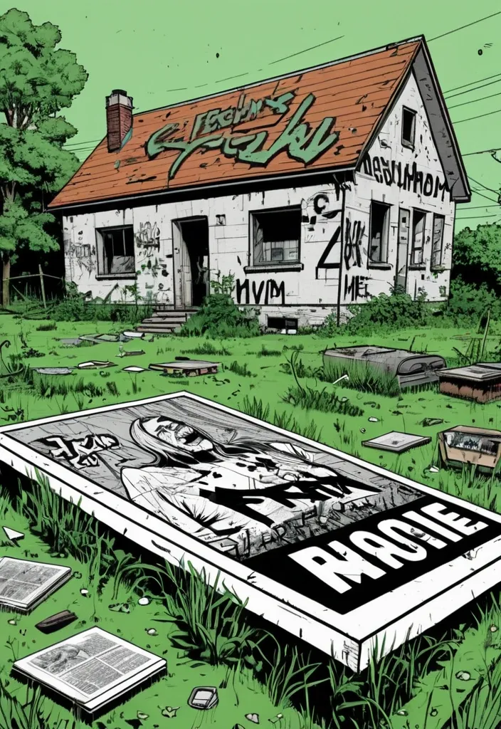 Создать дизайн оверсайз футболки в стиле комикса с изображением на нем панельного заброшенного дома с заброшенным двором поросшем травой на котором играют дети и лежат пьяные люди , в верхней части футболки надпись в стиле граффити небольшими буквами «Чудово» ,