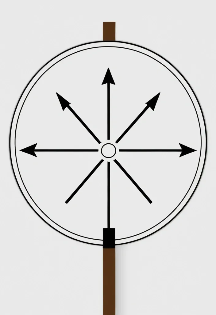 на белом фоне изображён круг , в центре круга отмечена большая точка , на этой точке закреплена палочка (одна) , на палочке на двух сторонах от центра на равном расстоянии отмечены три точки , которые меньше центральной , по краям откружности отмечены две стрелочки , показыавающие направление движения (стрелочки соноправлены с окружностью и находятся внутри её) ,