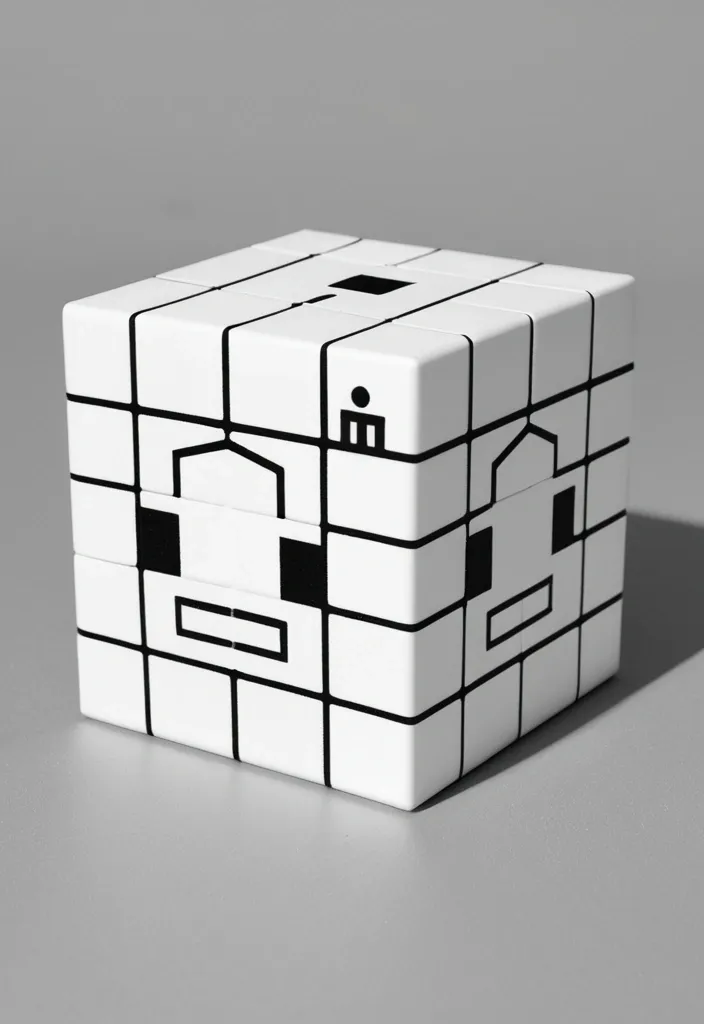 A minimalist , black-and-white vector line art illustration of an isometric 3D cube. The top panel features an inner concentric square outline ,