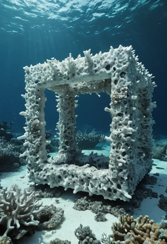 Can you generate me a prompt - Wolf Hilbertz Biorock structure underwater , steel frame covered in white mineral growth , coral beginning to colonise the surface , tropical ocean , photorealistic , 16:9 tag @werdna696x bottom right corner ,