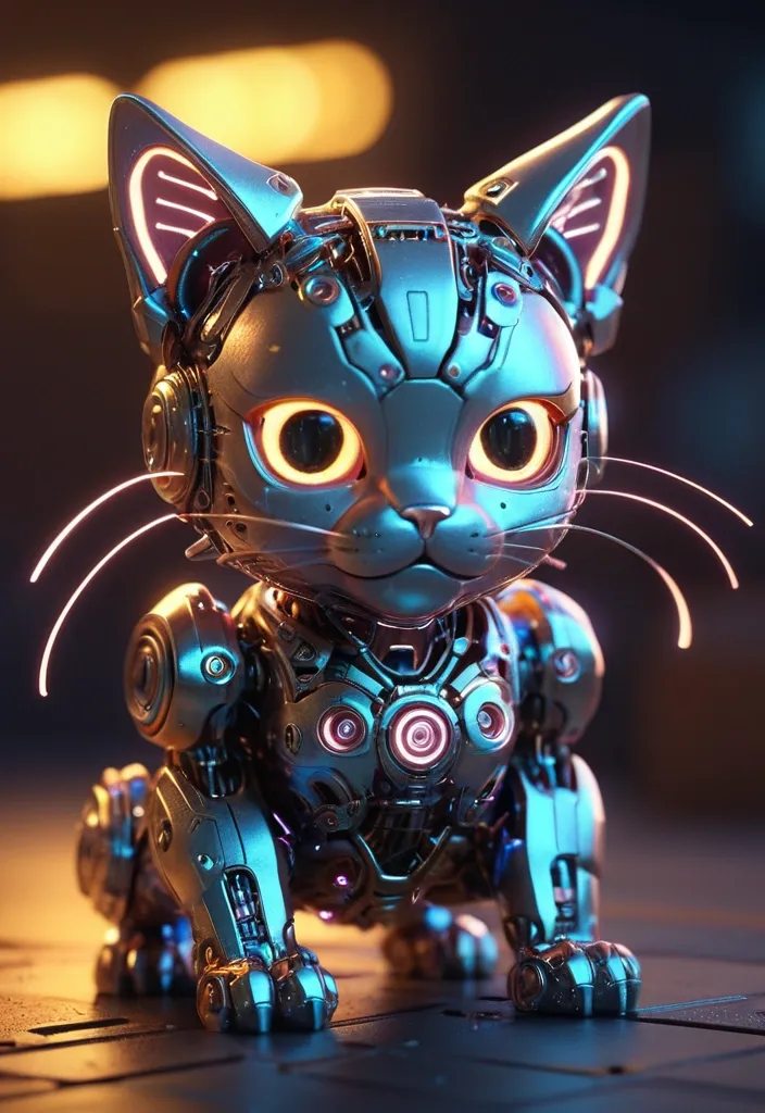 A hyper-detailed complex 3d render of a cute cyborg kitten made out of metal , glowing cinematic , detailed wire , vibrant details , unreal engine , octane render , cinematic shot , flawless detail , award-winning , expertly crafted , meticulously composed photography , creative , 8k , rim light , dynamic lighting ,